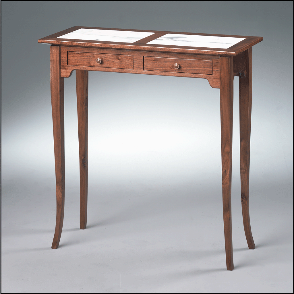 - Two drawers with brass knobs and walnut inserts